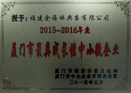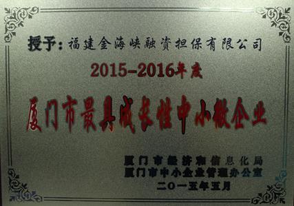 20155月,福建金海峽融資擔(dān)保有限公司、福建金海峽典當(dāng)有限公司分別獲得廈門市經(jīng)濟(jì)和信息化局和廈門市中小企業(yè)管理辦公室共同授予的“2015-2016年度廈門市最具成長性中小微企業(yè)”的稱號。