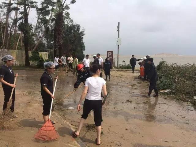 金門灣酒店位處臺風(fēng)登陸點(diǎn),當(dāng)晚全體管理人員留守酒店值班,處理滲水,加固門窗。臺風(fēng)登陸后,又忙于周邊環(huán)境的清理和受損發(fā)電機(jī)的維修。家住酒店附近此次臺風(fēng)登陸點(diǎn)歐厝村的員工連家都沒有回,幾天來一直奮戰(zhàn)在抗臺救災(zāi)的現(xiàn)場。
