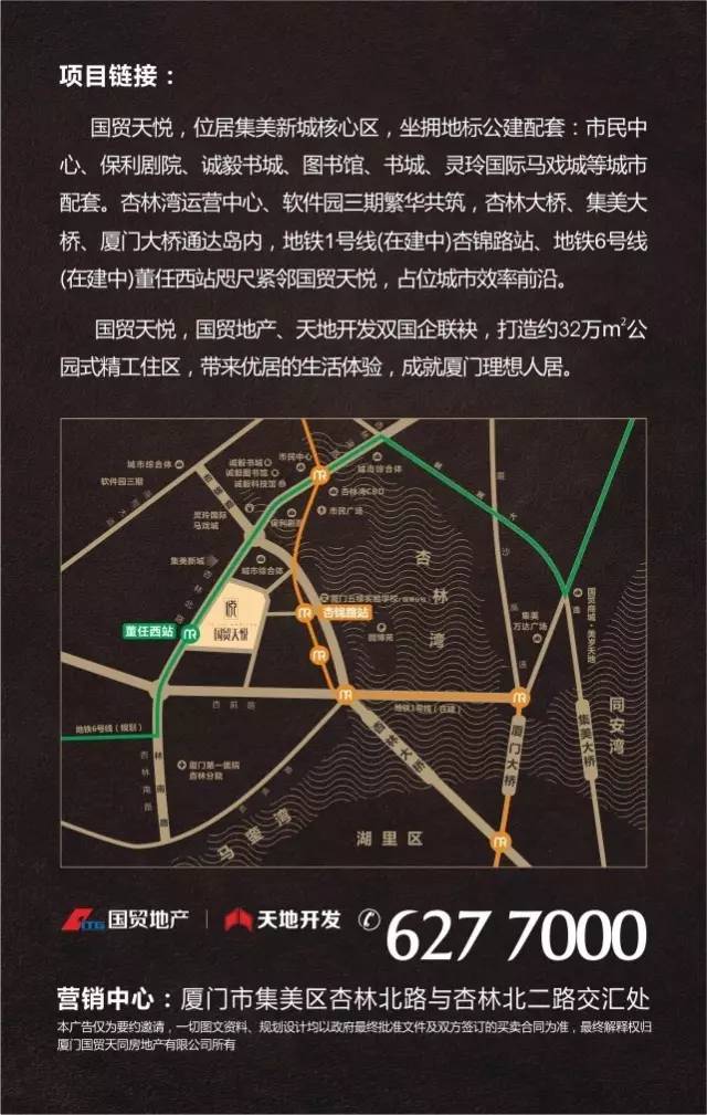 集美大橋、廈門大橋、BRT樞紐、地鐵6號線(在建中)構(gòu)成立體便利交通網(wǎng)絡(luò);國貿(mào)商城·美歲天地、集美萬達廣場、新華都購物廣場享受常伴左右,近享集美老城區(qū)的便利生活。目前國貿(mào)商城·集悅、國貿(mào)商城·同悅臨街鋪全面發(fā)售中。