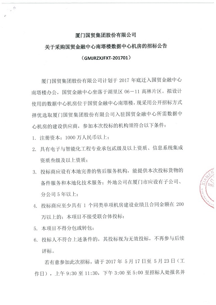 國貿(mào)金融中心機(jī)房系統(tǒng)招標(biāo)公告