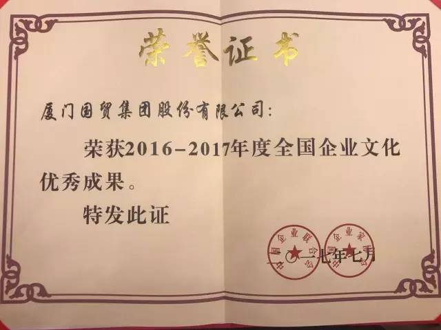 7月22日,在2017全國(guó)企業(yè)文化年會(huì)上,中國(guó)企業(yè)聯(lián)會(huì)會(huì)、中國(guó)企業(yè)家聯(lián)合會(huì)表彰了2016-2017年度全國(guó)企業(yè)文化建設(shè)突出貢獻(xiàn)人物、全國(guó)企業(yè)文化優(yōu)秀案例和全國(guó)企業(yè)文化優(yōu)秀成果。廈門國(guó)貿(mào)作為廈門地區(qū)唯一的代表獲得了全國(guó)企業(yè)文化優(yōu)秀成果獎(jiǎng)。