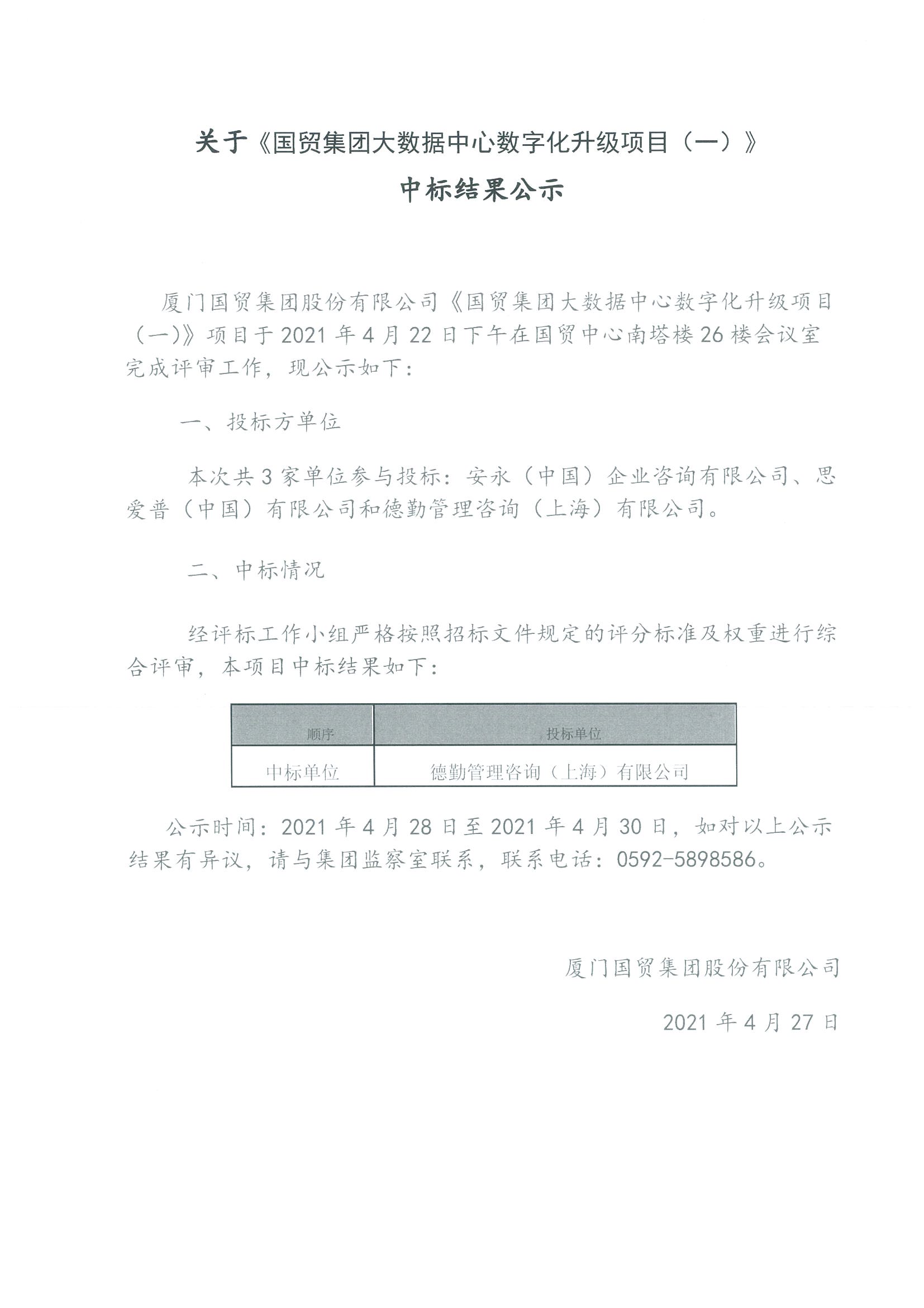 關于《國貿(mào)集團大數(shù)據(jù)中心數(shù)字化升級項目(一)》采購中標結果公示