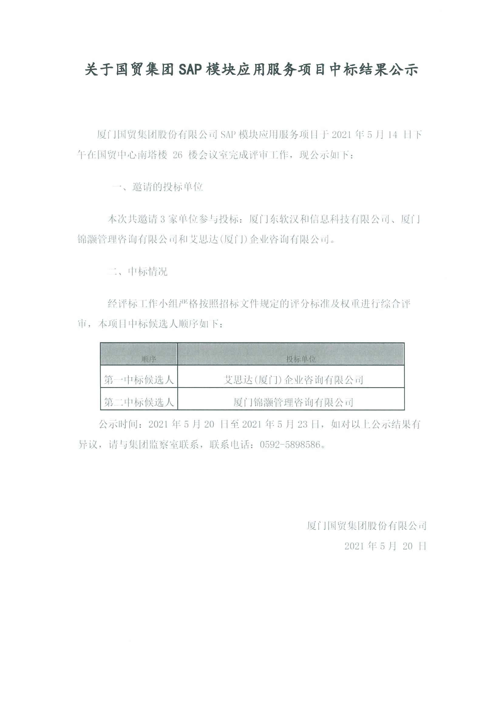 關(guān)于國貿(mào)集團(tuán)SAP模塊應(yīng)用服務(wù)項(xiàng)目中標(biāo)結(jié)果公示