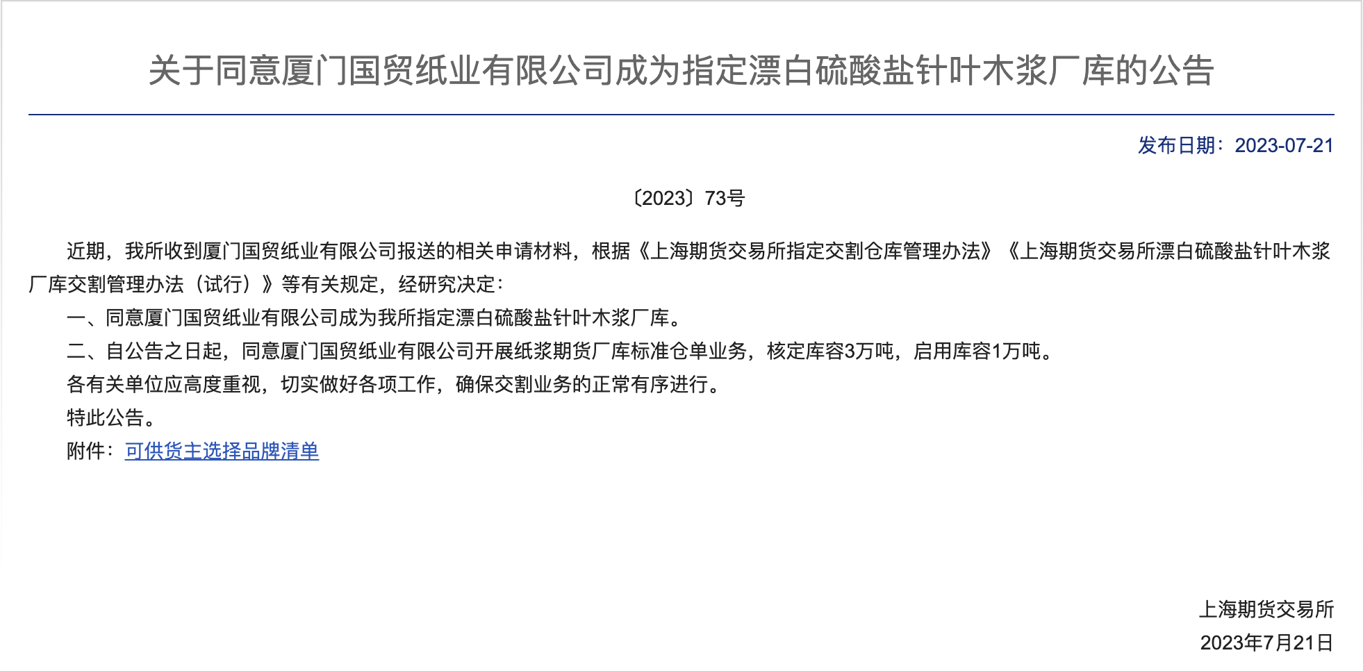 國貿(mào)紙業(yè)成功獲批漂白硫酸鹽針葉木漿廠庫資質(zhì),該資質(zhì)為國貿(mào)股份于上期所取得的首個期貨交割庫資質(zhì)。